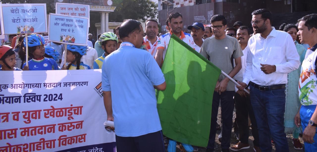 नांदेड, दि.२१: जिल्हा प्रशासन व जिल्हा क्रीडा कार्यालयाच्‍यावतीने रविवारी सकाळी 7.30 वाजता मतदान जनजागृतीसाठी “वॉकथॉन” रॅलीचे आयोजन करण्‍यात आले होते. यावेळी जिल्‍हाधिकारी अभिजीत राऊत यांच्‍या हस्‍ते “मी मतदान करणारच” या सेल्फी पॉईंटचे फित कापून व सेल्फी काढून शुभारंभ करण्‍यात आला. तसेच त्‍यांच्‍या हस्‍ते वॉकथॉन रॅलीस हिरवी झेंडी दाखवून सुरुवात करण्यात आली.
