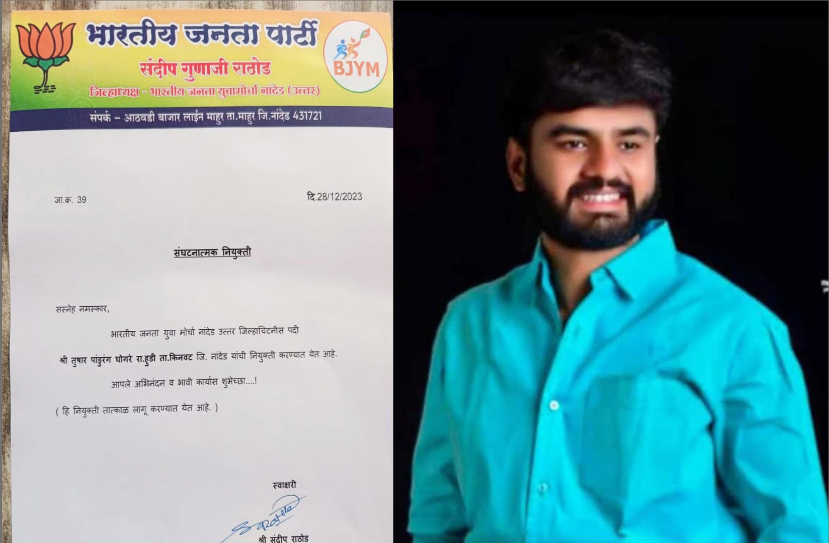 या बाबत सविस्तर वृत्त असे की भारतीय जनता पार्टी मध्ये तुषार घोगरे पाटील हे पक्षाशी एकनिष्ठ राहून काम करण्याची शैली हे त्यांच्या सहकाऱ्याकडून ऐकावयास मिळत आहे तुषार घोगरे पाटील हुडीकर यांना भाजपा युवा मोर्चा नांदेड जिल्हा चिटणीस पदाची जबाबदारी देऊन तरुण वर्गात उत्साह संचारला असे दिसून येत आहे. पक्षाने मोठी जबाबदारी दिल्याने पक्षाचे ध्येय धोरणाच्या अधिन राहून काम करू असे यावेळी तुषार घोगरे यांनी सांगितले यावेळी किनवट माहूर निवडणूक प्रमुख व भाजपा प्रदेश कार्यकारणी सदस्य महाराष्ट्र डॉ. अशोक पाटील सुर्यवंशी सह आदी जणांनी त्यांचे अभिनंदन करून त्यांना पुढील वाटचालीसाठी शुभेच्छा दिल्या...