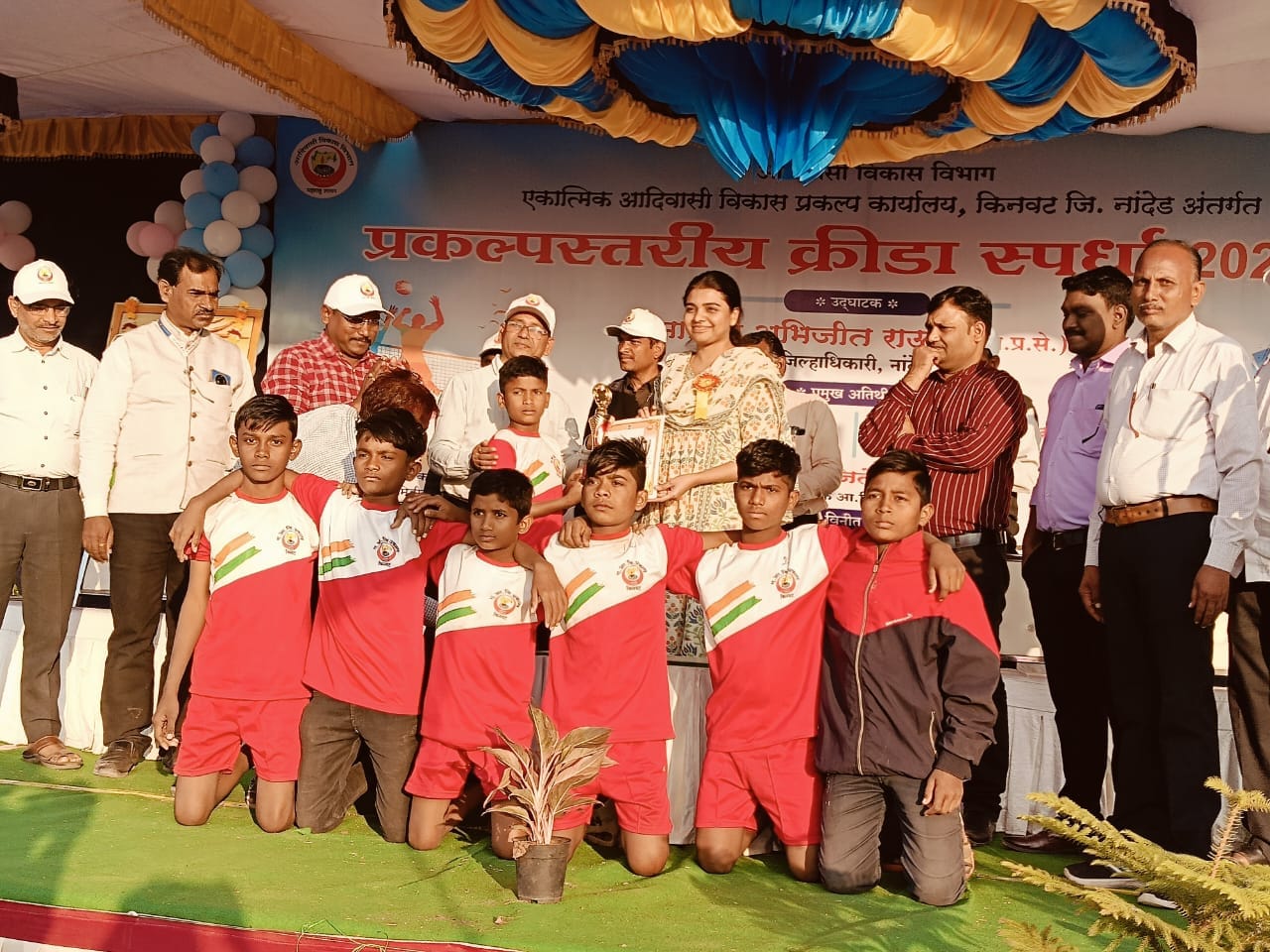 हिमायतनगर दि.२९: नांदेड जिल्ह्यातील किनवट येथे दिनांक 26 नोव्हेंबर ते 28 नोव्हेंबर या कालावधी मध्ये जिल्हा स्तरीय प्रकल्प क्रीडा स्पर्धेचे आयोजन करण्यात आले होते या स्पर्धेमध्ये हिमायतनगर तालुक्यातील शेषराव चंद्रावर राऊत अनुदानित आश्रम शाळेच्या विद्यार्थ्यांनी सहभाग घेऊन हॉलीबॉल स्पर्धेत घवघवीत यश संपादन केले या प्रकल्पात संपूर्ण जिल्ह्यातील शासकीय व अनुदानित आश्रम शाळेच्या विद्यार्थ्यांनी सहभाग घेऊन आपल्या गुणांना वाव दिला या स्पर्धेत हिमायतनगर तालुक्यातील मौजे महादापूर येथील शेषराव चंद्रावर राऊत अनुदानित आश्रम शाळेतील विद्यार्थ्यांनी वयोगट 14 वर्ष ते 17 वर्षे वयोगटातील हॉलीबॉल स्पर्धेत प्रथम क्रमांक पटकावून दोन्ही संघांनी विजय मिळवित त्यामुळे विभागीय क्रीडा स्पर्धेसाठी ते पुढे पात्र झाले आहेत त्यामुळे किंनवट येथील सहाय्यक जिल्हा अधिकारी तथा प्रकल्प अधिकारी मेघना कावली यांच्या हस्ते त्यांचा सत्कार करण्यात आला.