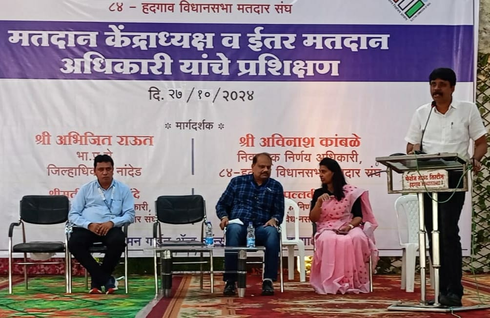 हदगाव दि.२८: हदगाव विधानसभा मतदार संघाच्या निवडणूकीसाठी काल व आज झालेल्या निवडणूक प्रशिक्षणात निवडणूक निर्णय अधिकारी अविनाश कांबळे उपजिल्हाधिकारी प्रशांत शेळके सहायक निवडणूक निर्णय अधिकारी श्रीमती पल्लवी टेमकर आदींनी कर्मचाऱ्यास मार्गदर्शन केले दोन दिवस संपन्न झालेल्या प्रशिक्षणात ७३अधिकाऱ्यांनी दांडी मारली काल १५ मतदान केंद्राध्यक्ष तर १३ सहायक मतदान केंद्राध्यक्ष प्रशिक्षणाला गैरहजर राहिले तर आज झालेल्या इतर मतदान अधिकारी ८५८ कर्मचाऱ्यांना निवडणुकीचे आदेश देण्यात आले होते यात ८१३ जणांनी उपस्थिती नोंदवली दोन व तीन इतर मतदान अधिकाऱ्यात ४५ इतर मतदान आधिकाऱ्यांनी दांडी मारली आज ९४.७५ टक्के तर काल ९६.५२ टक्के कर्मचाऱ्यांची उपस्थिती होती प्रशिक्षणास दांडी मारणाऱ्यात बी.एल.ओ. तसेच निवडणूक कक्षात असलेल्या कर्मचाऱ्यांना वगळून इतरांना नोटीसा बजावून कारवाई करण्यात येणार असल्याचे निवडणूक निर्णय अधिकाऱ्यांनी कळवले असल्याचे सहायक महसूल अधिकारी किशन गुळगुळे यांनी कळवले असल्याचे मीडिया कक्षातून अनिल तामसकर,अनिल दस्तूरकर यांनी कळवले आहे.
