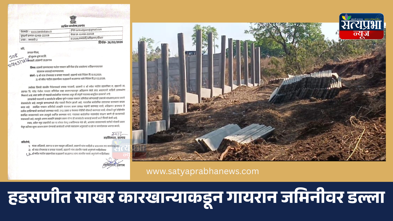 निलेश गायकवाड | तुषार कांबळे | हदगाव : हदगाव तालुक्यातील मौजे हडसणी येथे सार्वजनिक गायरान जमिनीवर साखर कारखान्याने अनधिकृतपणे अतिक्रमण केल्याचा गंभीर प्रकार समोर आला आहे. विशेष म्हणजे, माननीय तहसीलदारांनी या कामाला स्थगिती दिली असतानाही, प्रशासकीय आदेशाला केराची टोपली दाखवत कारखान्याने अतिक्रमणाची भिंत उभारली आहे. या प्रकारामुळे हदसणीतील ग्रामस्थ आक्रमक झाले असून परिसरात तणावाचे वातावरण निर्माण झाले आहे.